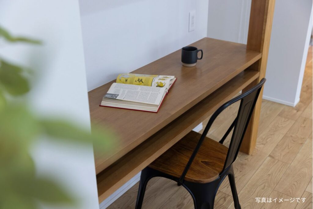 寝室の奥に設けた書斎は、家族の生活リズムを気にせず集中できる空間です。持ち帰り仕事や作業も、家族が休んでいる間でも安心して取り組めます。周囲からの視線や音を気にせず過ごせるため、効率的に作業が進むだけでなく、オンとオフの切り替えもしやすいのが魅力です。