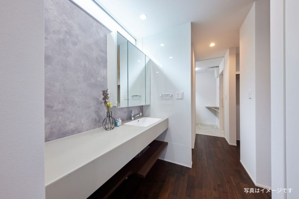 脱衣所・ファミリークローゼット・キッチンをつなげた回遊動線で、家事も身支度もスムーズに。洗濯物を干して、そのまま収納できるファミリークローゼットまで一直線で移動でき、料理や後片付けの動きとも自然につながります。無駄な動きを減らし、忙しい毎日の家事時間を短縮できます。