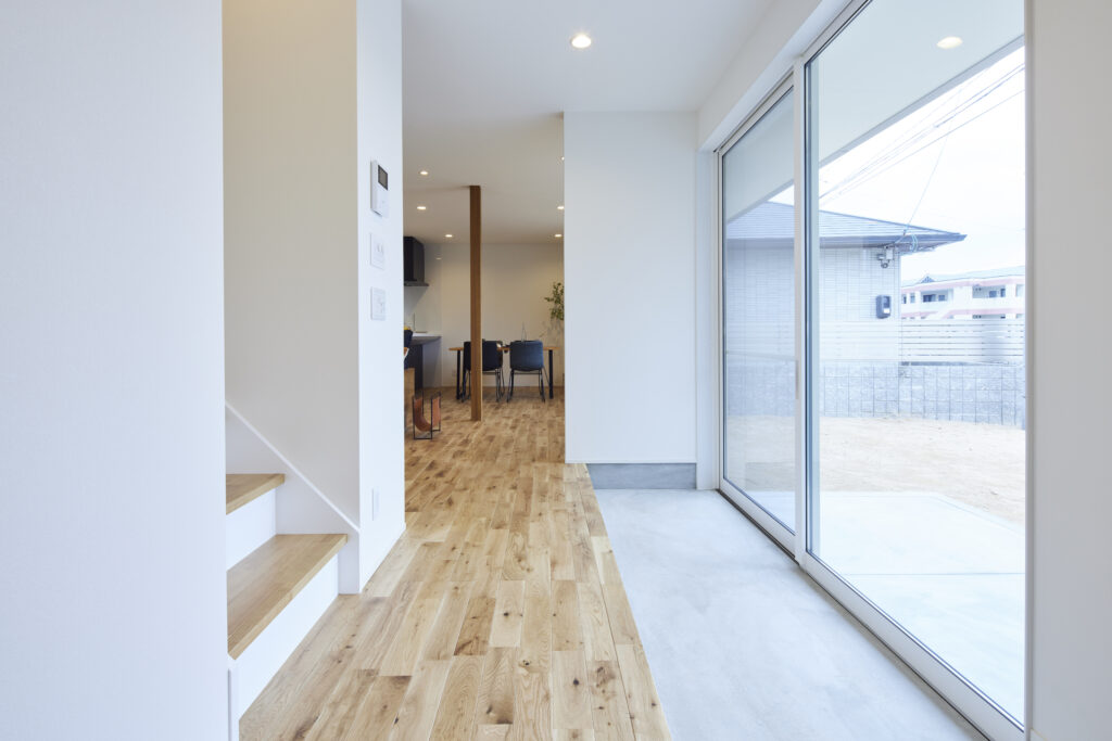 玄関からリビングまでL字型に続くモルタル仕上げの玄関土間は、靴のまま庭へ出られる開放的な動線。お家にゲストを迎える日にも活躍する広い土間は、暮らしにゆとりをもたらす空間です。