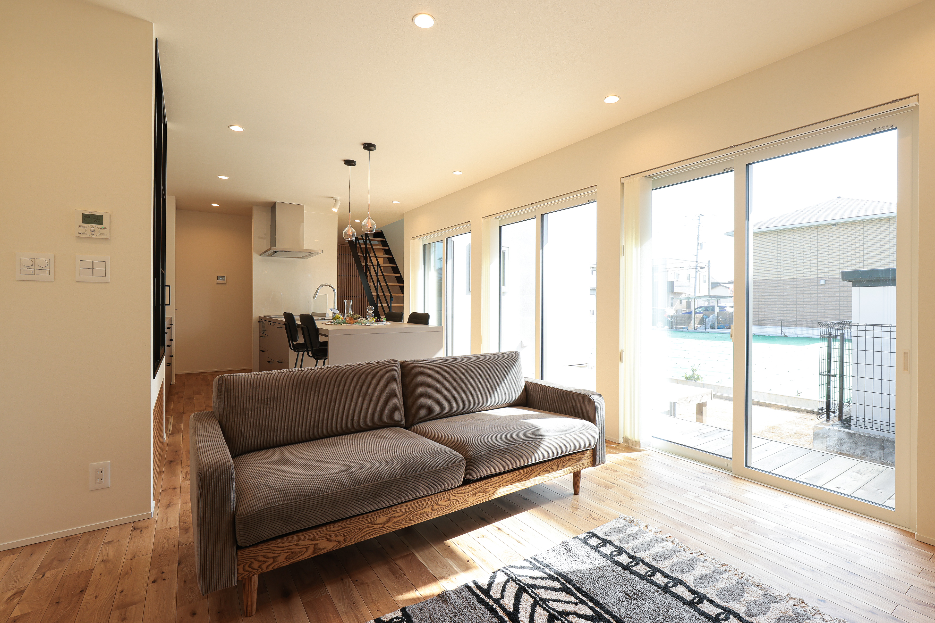 南側の掃き出し窓からウッドデッキと庭へ視線が抜け、