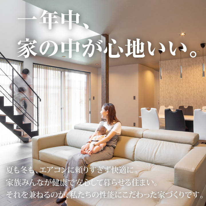 安本建設が実現する高性能とは、小さなエネルギーで室内が適温に保たれ、一年を通して快適な住まいを50年100年と永く持続できること。そしてその快適な住まいを小さなエネルギーで実現すること。