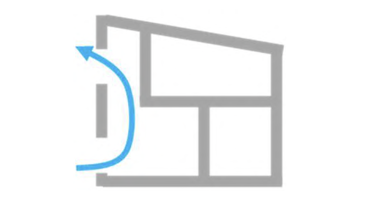 風は気まぐれで、どこから風が吹いてきても風が通る設計を目指しています。時期により頻繁に風が吹く風向きの風を卓越風と言います。この卓越風は風を通す設計のヒントにもなりますが、遮るものが無い上空と、 山や建物の影響がある地上では風の動きが異なるため、卓越風だけを前提とした計画では不十分です。アトリエアンデパールでは、特に確実に風通しを実現したいLDKでは、風向きに関わらず風が通る工夫として、全方位通風を採用しています。