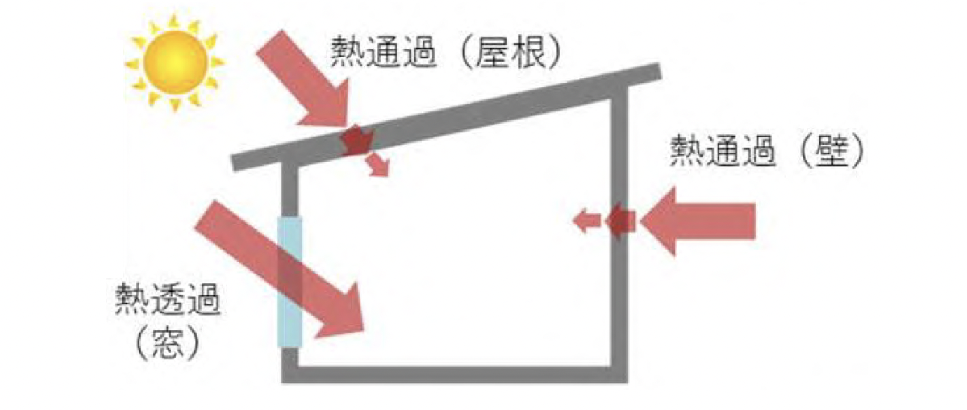夏場家の中が暑くなる大きな原因は窓から入る強い日差し(日射熱) にあります。窓に当たった日射熱は透過して室内にダイレクトに入ってきます。